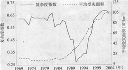 4、单选题 如图为1969—2004年我国东部H省洪灾面积和洪涝灾害的复杂度指数变化图。读图并结合所学知识,回答问题。
