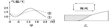 3、单选题 在图中,甲图表示的是“某滨海地区陆地和海洋表面气温日变化的曲线图”,乙图表示的是“该地区海陆之间气流的运动图”。读图,完成下列问题。