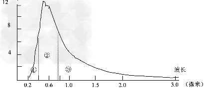 3、单选题 将一张白纸置于阳光下,观察投到纸上的阳光,结合太阳各种辐射的波长范围图。回答1~2题。