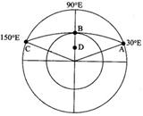 5、单选题 如下图所示,此时ABC弧线上的太阳高度角为0°,某学生正距B地正南方2775km的某地观测到北极星的仰角为42°,回答下列各题。