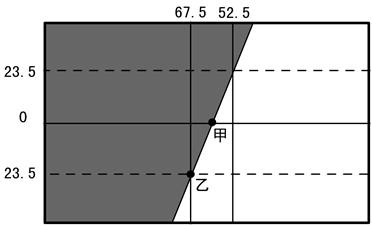 3、综合题  下图为某日部分地区昼夜示意图,阴影部分表示黑夜,其余部分表示白昼。此时图中晨昏线与甲地所在经线的夹角为15°。读图回答问题。(10分)