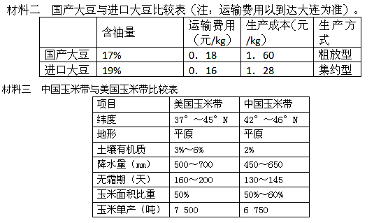 本题解析:本题考查中美农业生产的比较。(1)影响农业生产的自然条件主要从气候、地形、土壤、水源等方面分析,而影响机械化和水利化的主要是地形条件。(2)我国东北地区农业生产的最大优势的土地面积广阔,地广人稀,且黑土肥沃。(3)结合资料二反映进口大豆的含油量高,且价格较低。(4)结合材料三,从纬度、地形、土壤有机质、气候、种植面积比重、单产等方面分析。