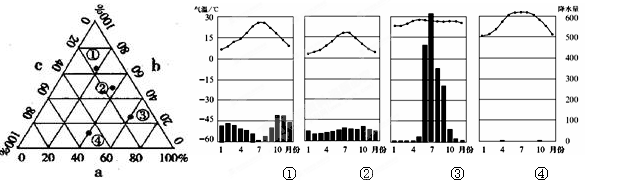 小题2:根据图中信息可知,①?–地中海气候,②—温带海洋性气候,③热带季风气候?,④热带沙漠气候。水稻适合在季风气候生长。选择C项。