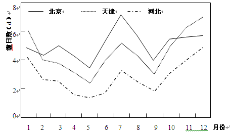 2、单选题 在风力较小、逆温、相对湿度较低的情况下,随着悬浮颗粒物的增多而导致大气能见度小于10千米的现象叫霾。图为北京、天津、河北三省市各月霾日数变化图,读图完成小题。