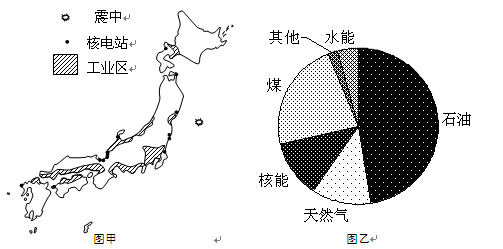 材料一:日本核电站分布示意图(图甲)日本能源构成示意图(图乙)