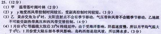 (2)乙区域同属一种气候类型,但x、y降水有差异,降水较多的地点是?(x,y),请分析其原因。(3分)