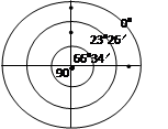 小题3:直接根据图示判断,太阳高度最大为中心90°,即太阳直射点,并向四周递减。