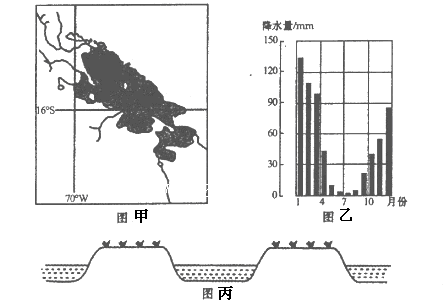 4、综合题  D湖泊(图甲)的湖面海拔约3800米,降水资料如图乙所示。D湖沿岸地区地形平坦,发现有大量古代农耕遗迹,包括相互交错的人工堆土高台、人工水渠(图丙),以及人工运河和水塘。回答下列问题。(10分)