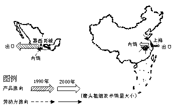 本题解析:24.?对比两幅图可看出,1990年此跨国公司的生产厂位于墨西哥城,产品主要外销;而2000年此公司在上海建厂,产品以内销为主,占领了中国市场。(2)题应结合我国的发展状况和劳动力资源优势分析。