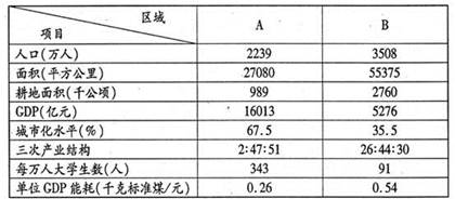 1、综合题 我国A区域位于沿海,海陆交通便利;B区域位于内陆山区,有两条省道通过,拥有丰富的煤铁资源。该表是两区域部分统计数据,据此回答下列问题。(10分)
