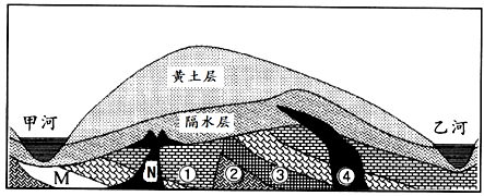 【小题2】岩浆岩有侵入型和喷出型岩浆岩两种类型,从N的上部岩层形状可知N为喷出型岩浆岩,后经外力作用被黄土覆盖;而④是侵入型岩浆岩,因此N岩浆活动比④早;N顶部为喷出岩,④顶部为侵入岩;图示岩层具有层理构造,为沉积岩,因此N和④下部岩层都为沉积岩,所以本题A正确。