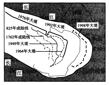 5、单选题 崇明岛位于长江入海口,是我国的第三大岛,也是一个面积不断增大的沙岛。读“崇明岛东滩成陆线和大堤随时间的变化图”,回答下列各题:
