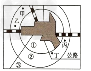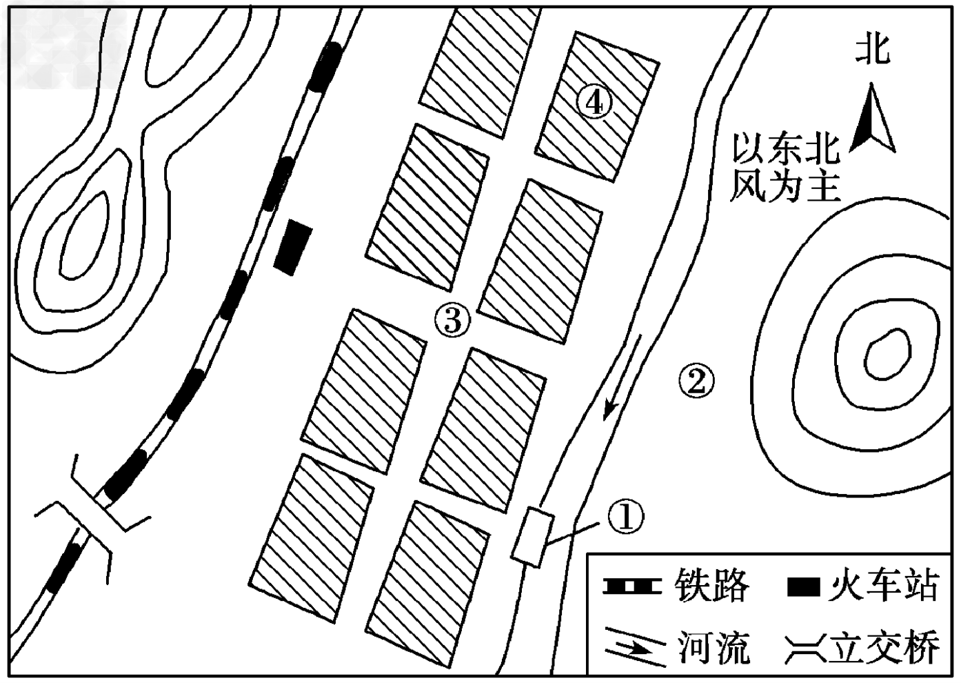 2、单选题 下图为平原地区某城市郊区工农业布局示意图(阴影部分表示城区),读图后回答1-2题。