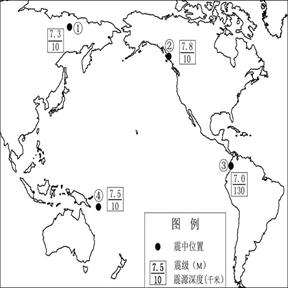 1.图示地区发生地震时间是1-2月,发生在12月22之后,3月21日之前,在此期间,太阳直射点逐渐北移,故答案A错误,图中震级最高的是②地区,7.8级,震源最深的是③地区130千米,故答案B错误,③处为南极洲板块与美洲板块交界处,属于碰撞边界,属于挤压消亡地带,,故答案C错误,④处位于海洋,地震时容易引起海啸,故答案选D。