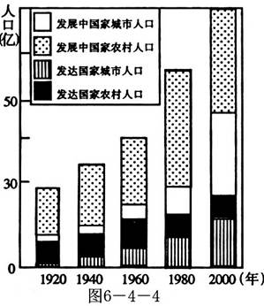 本题解析:首先观察图上各部分人口所占的比重,1920年发展中国家城市人口和农村人口共10亿左右,2000年增长到50亿左右。总人口增长速度最快的是发展中国家。1920年发展中国家城市人口2亿左右,而2000年增长到近20亿,城市人口增长速度最快的仍然是发展中国家。1980年以后,发达国家出现逆城市化现象,而发展中国家城市化的速度超过发达国家,城市人口迅速增长。
