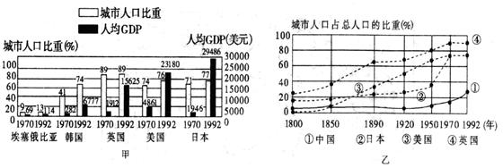 材料二:“部分国家城市化及其经济发展情况统计图”(图甲)和“部分国家城镇人口在总人口中所占百分比统计图”(图乙)。