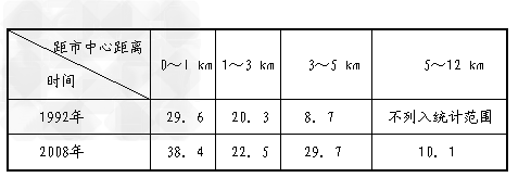 4、单选题 城市建筑的密度与高度受多种因素的影响。下表为某城市1992 年和2008 年距市中心不同距离建筑物的平均高度表( 单位:米) ,回答1-3 题。