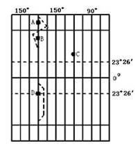 5、单选题 读图,D地此时是2011年12月21日的正午,此时一艘轮船从A地出发,航行6天后到达B地,然后又继续航行10天,到达目的地C地(32°N)。据此回答问题。