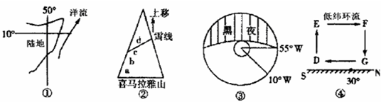 2.①为北印度洋季风洋流,此时顺时针表示北半球的夏季;②为喜马拉雅山雪线上升,为北半球的夏季;③中由55°W和10°W可以判断自转的方向为顺时针,从南极上空的俯视图,南半球昼长夜短,北半球的冬季;④图为低纬环流,G为副热带高气压带,D为赤道低气压带,因为30°靠近G,该图为北半球低纬环流,气压带偏北,为北半球的夏季;与“11·21”透水事故吻合的是③。