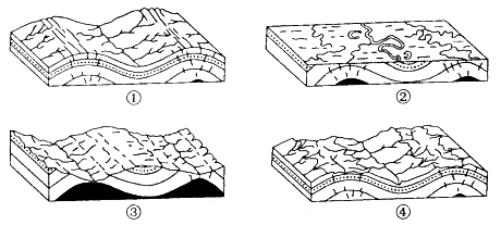 4、单选题 地质年代较老的褶皱构造地区常出现背斜成谷、向斜成山的“地形倒置”现象。下图为地形倒置形成过程示意图,读图完成下列各题。