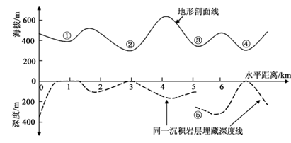 1、单选题 图是某地地形剖面及其地下同一沉积岩层埋藏深度示意图。岩层的埋藏深度(岩层距离地面的垂直距离)可以用来帮助恢复岩层的形态。读图回答(1)~(2)题。