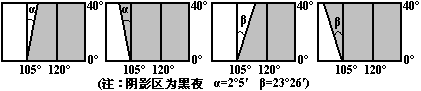 (3)若此日,晨昏线与经线的最小夹角达到一年中的最大值,则全球正午太阳高度达到一年最大值的纬度范围是                   ,全球正午太阳高度达到一年最小值的纬度范围是           ,全球昼长达到一年最小值的纬度范围是           ,全球昼长达到一年最大值的纬度范围是