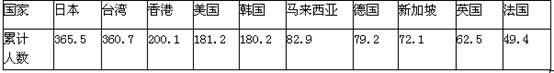 1、综合题 江苏是经济大省,也是旅游大省,阅读下列图表,回答问题:(⑴分)江苏“十一五”前四年入境旅游十大客源国(地区》累计人数统计表(单位:万人次)