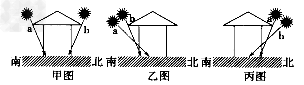 5、单选题 甲、乙、丙三幅图所示的是地处不同纬度的三座房屋二至日时的阳光照射情况(a或b)。读图,回答1~2题。