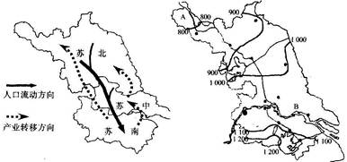 1、综合题 读“江苏省近十年产业转移与人口迁移方向”和“江苏省年降水量分布图”,回答下列问题。(10分)