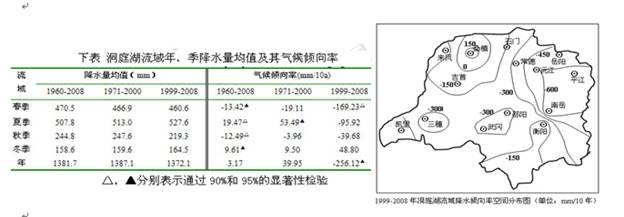 5、单选题 读洞庭湖流域年、季降水量均值及其气候倾向率表和1999年--2008年洞庭湖流域降水倾向率空间分布图(降水倾向率为正值,表示降水有增多趋势,值越大增多趋势越明显)。回答下列各题。