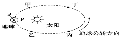 小题2:据上题可知P点处太阳直射南半球,大致在冬至日(12月22日前后),甲、乙、丙、丁四点将轨道均分成四等份,每等份约3个月,P点位于甲和乙中间,地球从P点运动到乙处约需一个半月,所以地球到达乙处时正好在春节前后,答案是B。