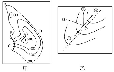 2、乙图为甲图中某地等高线的一部分,实线为等高线(单位:米),虚线为泥石流路线,某游客此时正好位于O点,则其正确的逃生路线是图乙中①~④中的哪一条路线?