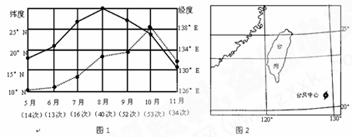 2.本题考查地理图标的判断。根据题目叙述,到达台湾东部沿海的经纬度可以估计,经度大约位于125°E,纬度大约为23°N,对照图1,这个台风可能出现的时段是6-7月。所以本题选择B选项。