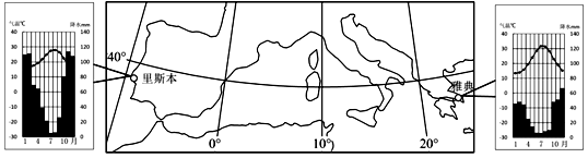 4、单选题 欧洲的里斯本、雅典两地气候类型相同,但两地测得的气温和降水量呈现出一定的差异。读图完成下列小题。