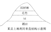 本题解析:由图中垂直方向上农作物生长的变化推断(毛竹主要分布在江西、湖南等地区),该地区位于长江以南低山丘陵地区,是一种典型的立体农业,亚热带季风气候,雨热同期,夏季高温多雨,冬季低温少雨。综上所述,第(1)题选C,第(2)题选B。