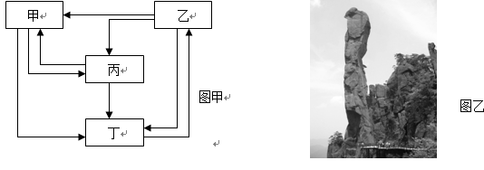1、单选题 图乙表示巨蟒出山风景,它是江西三清山标志性景观,海拔1200余米,相对高度128米,是由风化和重力崩解作用而形成的巨型花岗岩石柱。图甲为地壳物质循环示意。结合相关知识完成第问题。