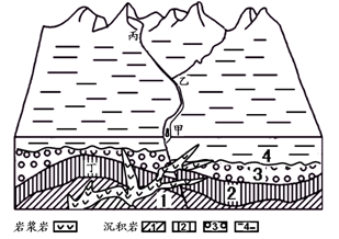 1.乙处的地形及地质构造是2.有关岩层沉积的先后顺序是?