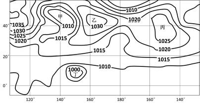 【小题2】图示尼豪岛(21°N,160°W)附近海域是高气压中心丙控制,北半球受地转偏向力影响,高压中心风是顺时针方向由中心向四周吹的,尼豪岛在高压中心的南侧,吹东北风,岛上旗帜将飘向西南方。选C正确。