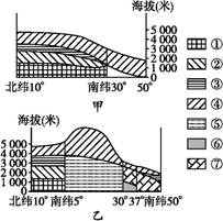 4、单选题 甲、乙两图代表安第斯山脉东西两坡上的植被分布,①~⑦代表不同的植被。据此完成小题。