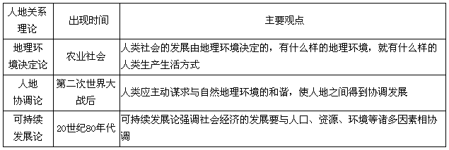 1、填空题 在人类社会发展过程的不同时期,出现了不同的人地关系思想和理论,运用所学知识填写下表。
