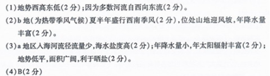 (3)分析说明a地区较b地区海盐生产的优势条件。(4分)