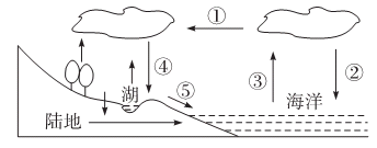 ①表示水汽输送,③表示蒸发,④表示降水,⑤表示地表径流,包含这几个环节的水循环为海陆间循环;