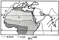 本题解析:本题考查世界区域地理。(1)图示A位于回归线以内,为热带。此时南亚盛行西南季风,判断为北半球夏季,故太阳直射点位于北半球。(2)图示B位于刚果盆地,为热带雨林气候。E位于地中海沿岸,受地中海气候影响,形成的自然带为亚热带常绿硬叶林带;B→C→D→E地自然带的变化呈南北方向自然带有规律的递变,故为纬度地带性分异规律,以热量条件为基础。(3)图示洋流①由较高纬流向较低纬,故判断为寒流;寒流对沿岸气候的影响为降温减湿。(4)图示②位于阿拉伯半岛与非洲大陆之间的红海。属于印度洋板块与非洲板块的张裂边界。(5)当A地盛行西南季风时,为北半球夏季,故北半球昼长夜短;长江流域处于雨季,故正处于汛期。