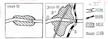 小题1:1949年,该城市是沿河流呈东西方向延伸,2010年有铁路和公路以后,城市的形态沿交通线向南北扩展。