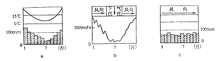4、单选题 读图,其中a图为某地气温与降水量示意图,b图为盛行风向(气流)与河流量示意图,c图为盛行风向与雨量示意图,回答下列各题