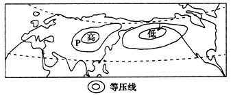 【小题1】图示在亚欧大陆上形成了一高压,陆地上形成高压,说明陆地气温低于同纬度的海洋温度,结合相关地理知识可知,P处高压为北半球冬季(1月)在亚欧大陆上形成的亚洲高压(蒙古-西伯利亚高压)。在北半球冬季,受此高压的影响下,我国长江中下游受强冷空气影响,出现低温干燥天气。D正确。