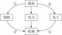 3、单选题 下图是“德国鲁尔区五大工业部门联系示意图”。读图完成下题