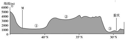 5、单选题 读下图“M地—重庆地形剖面示意图”。图中①、②、③三个地形区都是大型盆地地形,回答下列各题。