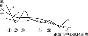 本题考查地理图表的判读能力。根据图示:a为商业的付租能力变化曲线;b为住宅付租能力变化曲线;c为工业付租能力变化曲线。图中②④段住宅的付租能力最高,可能布局住宅区。所以本题选择B选项。