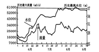 点评:本题难度中等,解答本题的关键是注意图中水位、流量变化趋势。另外本题还可考查长江洪灾的治理措施。“根本措施”应从导致长江河道淤积的根本原因入手,主要原因是由于长江上游地区的水土流失,而导致河流含沙量加大,故中下游河道淤积,故植树造林,保持水土是治理长江水患的根本措施。